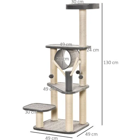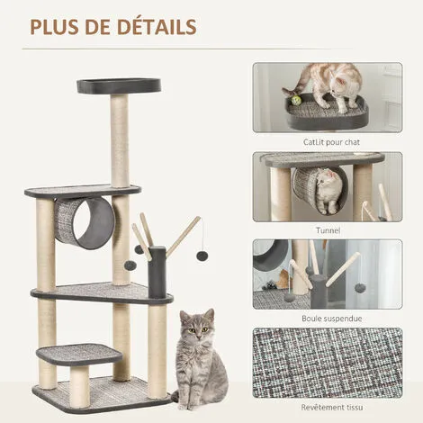 – Équipements multiples : plateformes (x 4), griffoirs, grattoirs, tunnel et jeu de boules suspendues