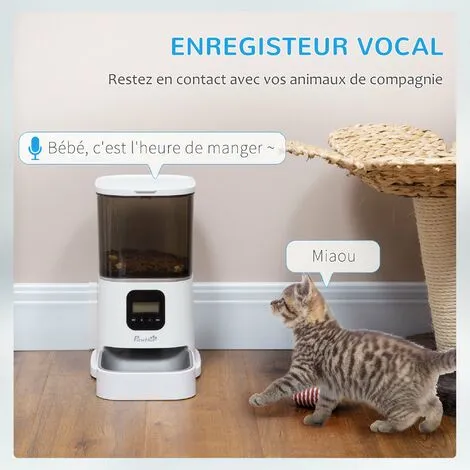 – Distributeur croquettes chat automatique avec fonction enregistreur vocal pour rassurer votre animal